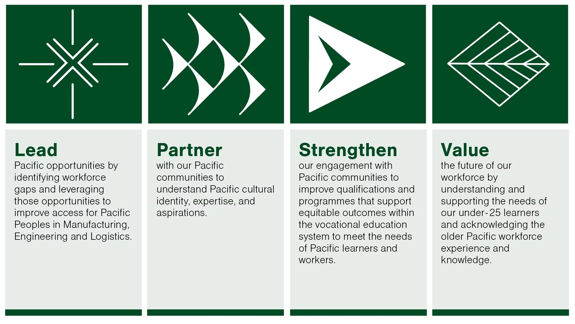Our work was guided by four priority goals that shaped how we partnered with Pacific communities, industry and education providers. These goals supported our focus on identifying opportunities, strengthening qualifications and training pathways, and recognising the cultural knowledge and aspirations of Pacific Peoples. They also provided a framework for understanding workforce needs and how to work with stakeholders to advance Pacific workforce development in manufacturing, engineering, and logistics. The four goals are outlined below.